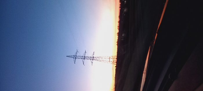 An electrical tower stands prominently against a gradient sky, transitioning from deep blue to a fiery orange. The tower's intricate lattice structure is sharply silhouetted. A strip of land, possibly a field or forest, stretches horizontally along the base, darkening towards the right. Hints of a road or pathway are visible, framed by the edge of a vehicle window, creating a sense of movement and perspective. The sunset casts a warm glow, highlighting the landscape's textures.