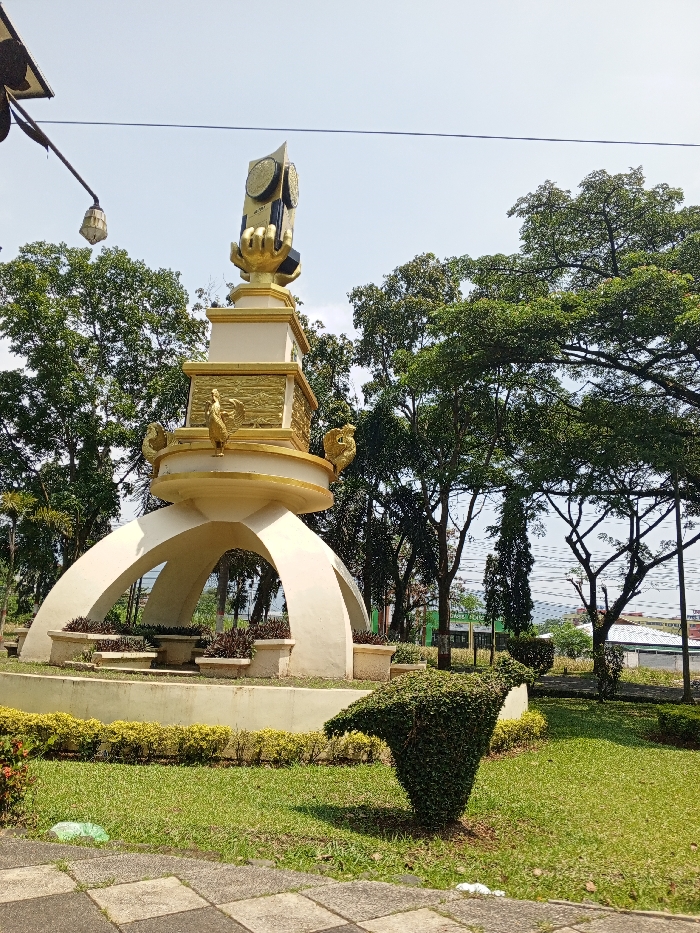 The scene is an outdoor view in Multhan, India, featuring a prominent, multi-tiered monument situated within a landscaped park or public garden