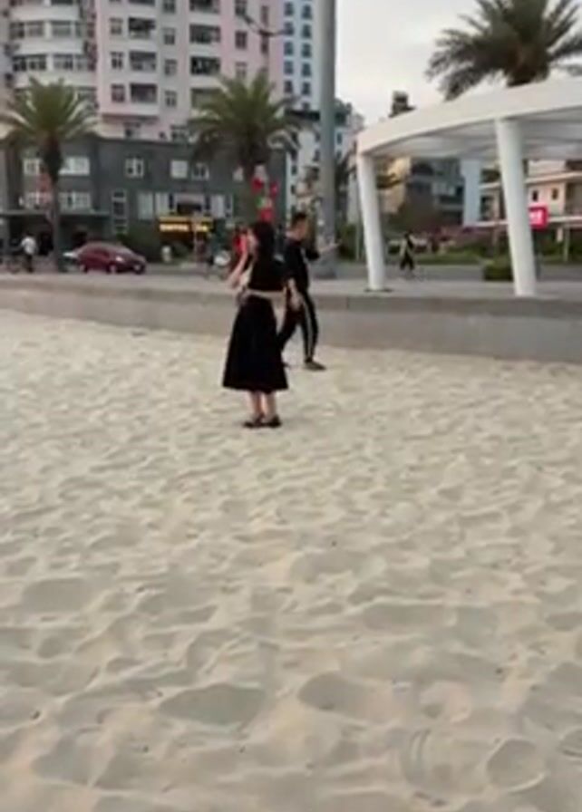 young woman and a young man standing on a sandy beach. The woman is wearing a black dress, and the man is wearing a black shirt and black pants with a white stripe down the side. The woman raises her hand to her face and appears to yawn or cough. The man is looking at his phone. In the background, there is a busy street with cars, motorcycles, and people walking and biking. There is a building with a "COFFEE TIME" sign on it and a large white structure with pillars. Palm trees are visible throughout the scene, and the sky is overcast.