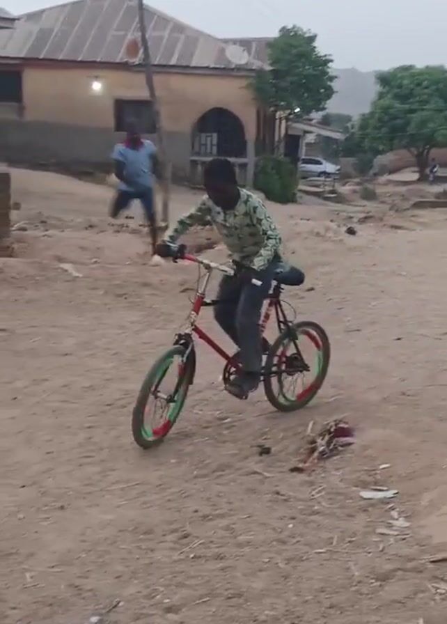 A young boy rides a small, red bicycle on a sandy dirt road in a village. The bicycle has green and red painted rims. The boy wears a long-sleeved, light green patterned shirt and dark pants. Two other children run behind him. Laundry hangs outside of the building in the background. The sky is overcast.