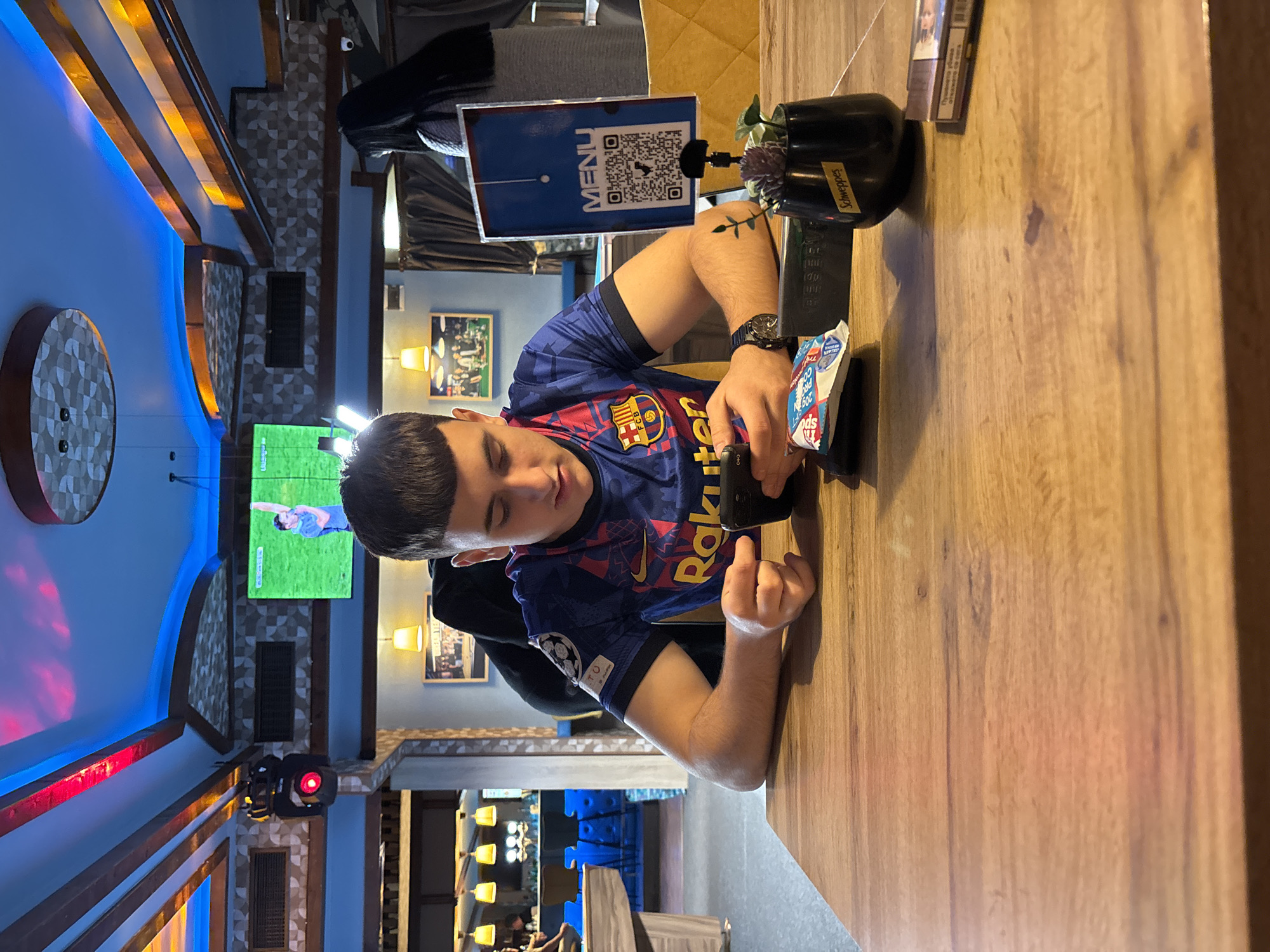 young man seated at a wooden table in what appears to be an indoor setting in Plovdiv, Bulgaria. The man is wearing a blue and red Barcelona football jersey and a watch. He is looking at a mobile phone he holds in his hand. On the table, there's a menu with a QR code, a small plant in a black pot with "Schweppes" visible on it, a packet of what appears to be protein bars, and a package of cigarettes. In the background, there is a television screen showing a sports game, wall decorations, and blue lights. The setting appears to be a restaurant or bar. Other tables and chairs are visible in the background.