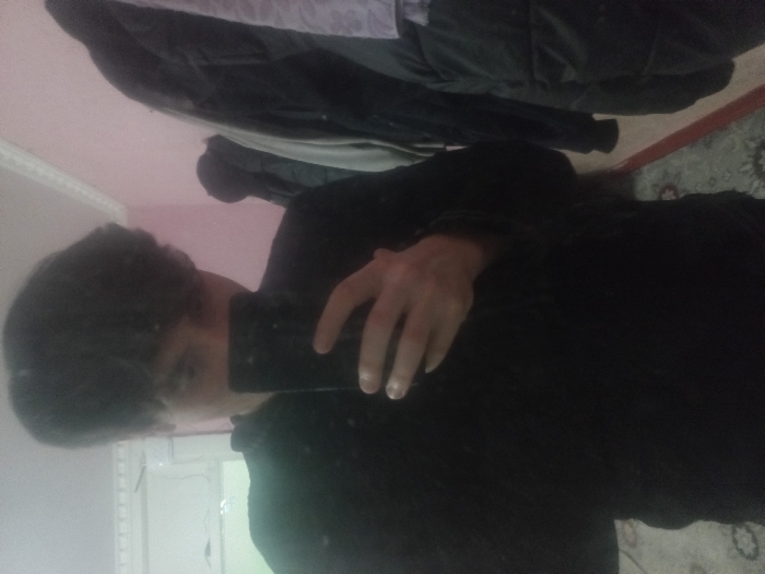 The scene is an indoor setting in Fergana City, Uzbekistan. A single individual, seen from the chest up, is taking a mirror selfie. The person has dark, shaggy hair, and their face is mostly obscured by a black smartphone held in their right hand, with only the upper forehead and eyes visible. They are wearing a dark, possibly black, long-sleeved garment. The background, reflected in the mirror, features a light pink wall on the right with white decorative molding along the top. Multiple dark-colored jackets or coats are hanging on the right side, suggesting a wardrobe or coat rack area. The lower portion of the reflection shows a light-colored floor, possibly wood or laminate, partially covered by a patterned rug in shades of gray and white.