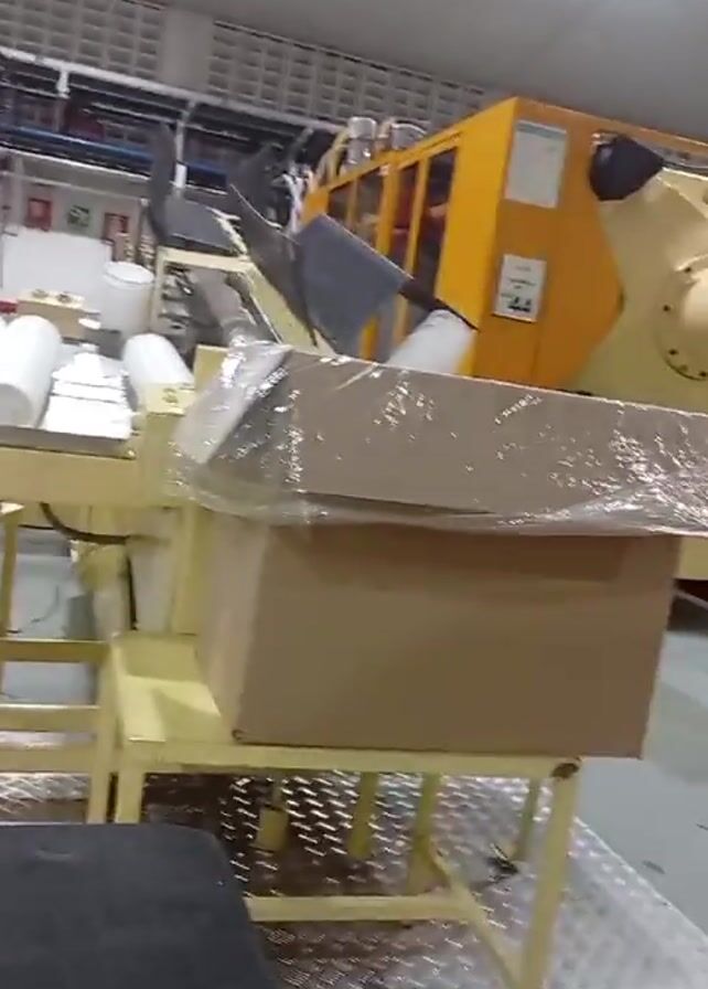 n industrial setting. The camera is moving, starting with a close-up of white cylinders on a table next to a conveyor belt. A box wrapped in plastic is on a stand beside the conveyor. The camera pans to the right, revealing large, yellow machinery. The floor is gray and has yellow safety lines. The camera continues to pan, showing more of the factory floor with various pieces of equipment. The lighting is bright, suggesting a well-lit work environment. The dominant colors are yellow, white, and gray. The sound of machinery is audible throughout the video.