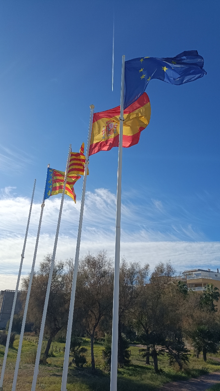 This photograph, captured in El Grau De Moncofa, Spain, presents an outdoor scene featuring four flags flying under a clear blue sky
