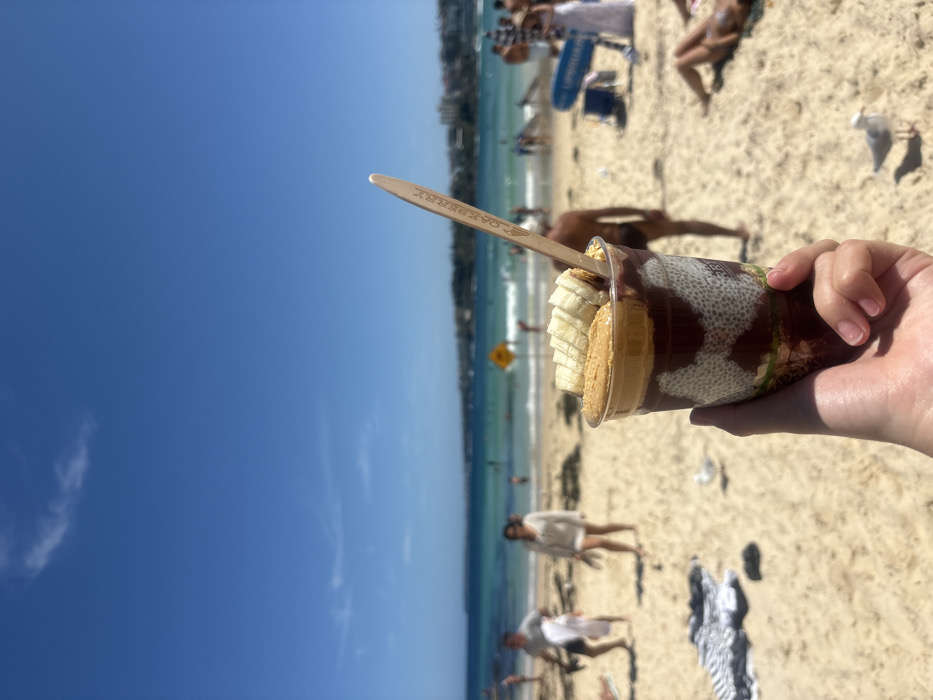 A person holds a dessert cup containing banana slices, a waffle, and a dark sauce, topped with a wooden spoon. The background shows a sunny beach scene with sand, the ocean, and people enjoying themselves. The sky is a clear, bright blue.