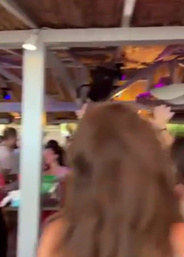 lively scene with a crowd of people dancing at what seems to be an outdoor beach bar or party venue. People are gathered closely, with many raising their hands in the air as they dance to the music. The environment has a casual, festive atmosphere, with a ceiling of a covered structure above. The lighting includes white structural beams and colorful stage lights casting blue and pink hues across the space. There's also a large round decorative item hanging from the ceiling. The music is upbeat and energetic, suggesting a vibrant social gathering. Most of the people visible appear to be young adults. The camera moves to capture different angles of the dancing crowd, showing a mix of outfits, including swimwear and casual attire. One male individual in a black t-shirt is visible from the back and his shirt says “ALEX”.