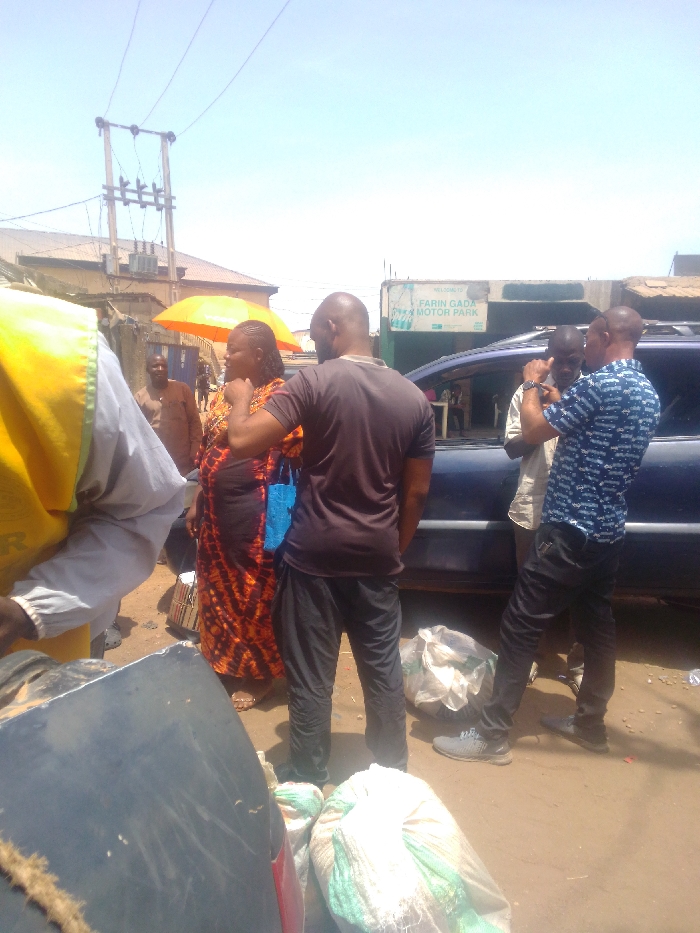 The image depicts an outdoor daytime scene at Farin Gada Motor Park in Mista Ali, Nigeria