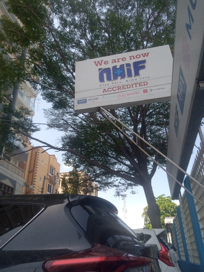 The image depicts an outdoor urban scene in Majengo ward, Kenya, viewed from a low-angle perspective looking upwards towards the sky and surrounding structures. A prominent white rectangular sign, supported by white metal struts, occupies the upper-center of the frame. The sign displays "We are now NHIF Aiya Yetu, Bima Yetu ACCREDITED" in red and blue lettering, followed by logos for APA, Heritage, LAISON, Minet, and O.MUTUAL. A large deciduous tree with green foliage dominates the upper background, its branches extending across the clear blue sky, partially obscuring parts of a light-colored multi-story building on the far left and a light brown building with white trim further back. In the immediate foreground, the rear portion of a dark-colored (likely black or dark grey) SUV or crossover vehicle is visible, featuring a red taillight and a rear spoiler. A white vehicle is partially visible behind and to the right of the dark SUV. A vertical structure with blue accents is partially visible on the far right, and a lattice communication tower is faintly discernible in the distant background. No individuals are present in the depicted scene.