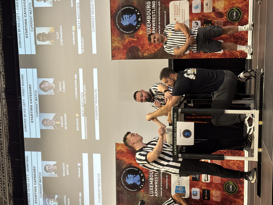 n arm-wrestling competition. Two men compete at a table with a referee closely monitoring them. Banners for "Luxembourg Armwrestling" are visible. To the left, a screen displays match schedules: Juniors 75 kg left - semifinal, Juniors 80 kg left - first round, and Juniors 90 kg left - first round. Competitor names and countries are listed, including Brandon Berthe from France, Amaury De Baoker from Belgium, and Illia Stepanenko from Ukraine. "Current Results" and "Next Matches" are displayed.