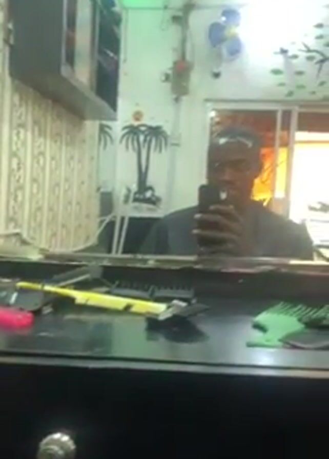 The video appears to be a selfie taken in a barber shop, reflected in a large mirror
