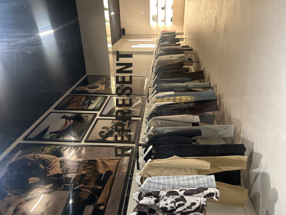 A retail display showcases clothing on hangers along a wall. Jeans and jackets in various denim washes, black, tan, plaid, and a cow-print jacket are visible. The brand name "REPRESENT" is spelled out vertically in large, block letters on the display's glass. A series of framed photographs with vintage-inspired subjects are affixed to the wall.