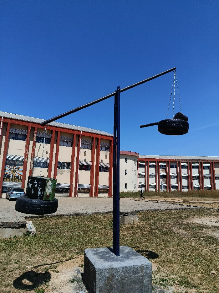 This image depicts an outdoor scene on the University of Jos, Naraguta Campus, in Jos, Plateau State, Nigeria, under a clear blue sky. The central focus is a dark blue metal art installation comprising a vertical pole anchored to a concrete base, supporting a horizontal crossbar. From the left side of the crossbar, suspended by metal chains, is an assemblage consisting of a black vehicle tire acting as a base, topped by a rectangular green metal container patterned with white designs, and a smaller, dark, indistinct object on its apex. From the right side of the crossbar, also suspended by metal chains, is a black vehicle tire containing a dark, possibly cylindrical, object, with a dark pipe-like extension protruding horizontally, resembling a stylized tank. In the background, two multi-story institutional buildings are visible. The building to the left features a light-colored facade with prominent reddish-brown vertical architectural elements and numerous windows; a multi-colored mural is visible on its lower section. A silver sedan is parked on a paved area in front of this building. The building to the right is also multi-story with a light-colored facade, featuring a distinct curved or circular section. In the mid-ground, between the art installation and the right-side building, a single individual is observed walking from right to left on a paved pathway. The immediate foreground consists of dry, patchy grass and bare earth. Concrete blocks are visible near the base of the art installation. The scene is brightly lit by direct sunlight, casting distinct shadows.