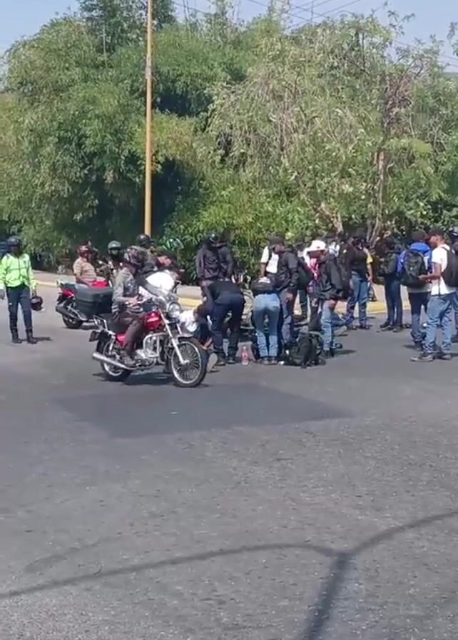 A group of people, some on motorcycles, are gathered on a street. A person lies on the ground, surrounded by others who appear to be attending to them. Two motorcycles are visible nearby, one being ridden away. A car with a visible license plate is also present. The setting appears to be an outdoor area with trees and a clear sky.