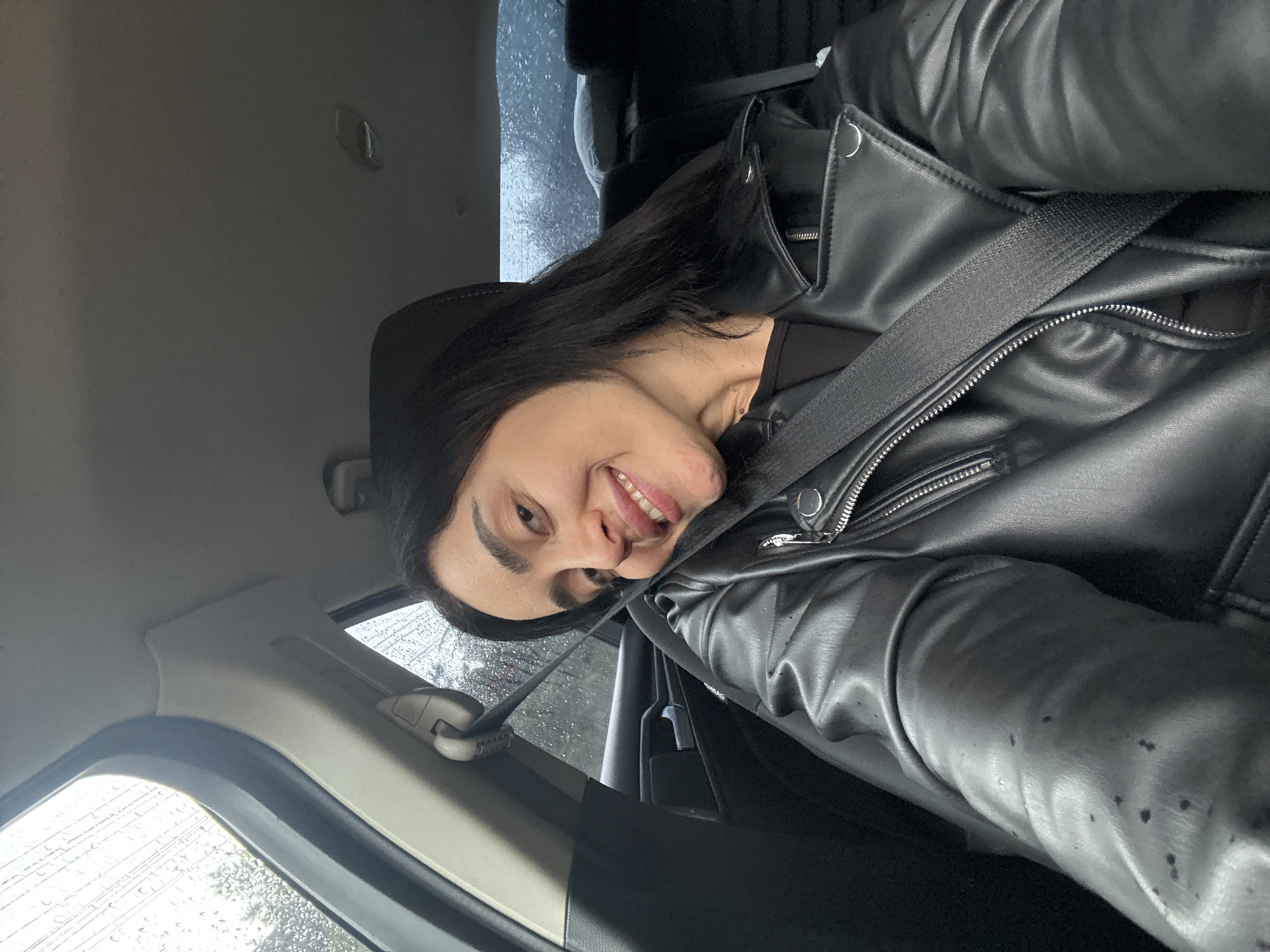A woman with dark hair is seated in the driver's seat of a car, wearing a black leather jacket and a seatbelt