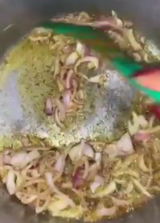 - "In an overhead shot, sliced red onions are being sauteed in a large silver pot filled with oil" by FM-eUvcj1, licensed under CC BY 4.0