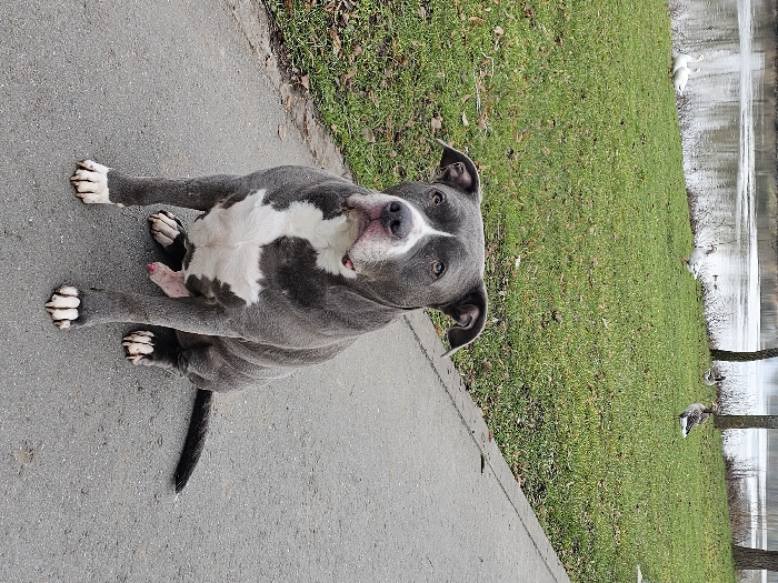 - "A medium-sized, short-haired dog, identified as an American Bully type, with a slate grey coat and extensive white markings on its chest, muzzle, and paws, sits on a dark grey asphalt path" by FM-n22Rc2, licensed under CC BY 4.0