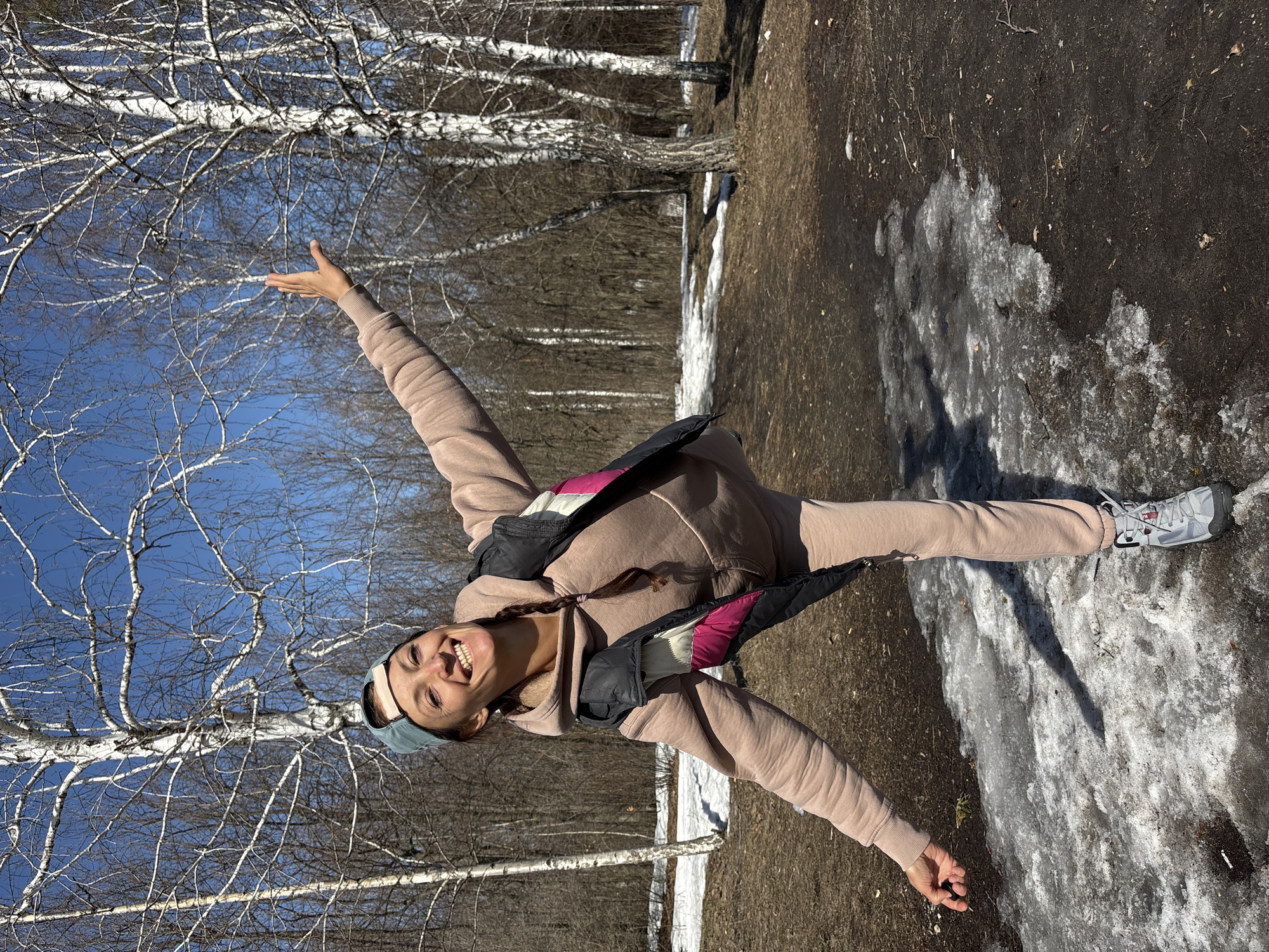 A woman stands outside in a park with a sunny blue sky in Ulyanovsk, Russia. She is wearing a tan sweat suit and a black and pink jacket. Her left leg and right arm are raised. White birch trees surround her. Some snow remains on the ground.