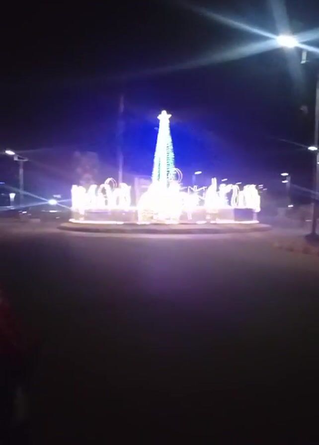 Christmas tree in the center of a roundabout at night. The tree is decorated with colorful lights, and the roundabout is adorned with glowing yellow figures. Street lights illuminate the scene. The video appears to be taken from a stationary position. A red object is briefly visible on the lower left side of the frame. The night sky is dark, and the area surrounding the roundabout appears dimly lit.