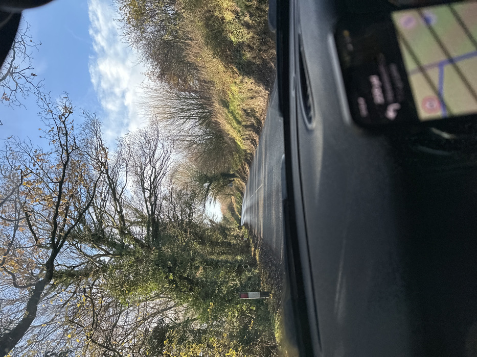 The image presents a forward-facing perspective from within a vehicle, observing a rural road in East Suffolk, United Kingdom. The lower portion of the frame is dominated by a dark vehicle dashboard, with a blurred electronic device, likely a smartphone displaying a navigation application, positioned on the right. The road ahead is a two-lane asphalt surface, appearing dark and reflective, suggesting dampness. It curves gently to the left in the mid-distance and then subtly to the right as it recedes. A faint central lane line is discernible. On the left side of the road, a dense line of mature deciduous trees and shrubs forms a partial canopy, with many branches bare or bearing sparse yellow-brown leaves. Some evergreen foliage is integrated within this line. A white cylindrical roadside marker post with a red top band is positioned near the left edge of the road. The right side of the road is bordered by an elevated, grassy bank sloping upwards, covered predominantly with dry, light-brown grass and sparsely leaved deciduous bushes and trees. The sky, visible above the tree line, is clear blue with scattered white, wispy clouds. No other vehicles, pedestrians, or prominent road signs are visible within the scene. The overall environment is consistent with a rural setting during late autumn or early winter.