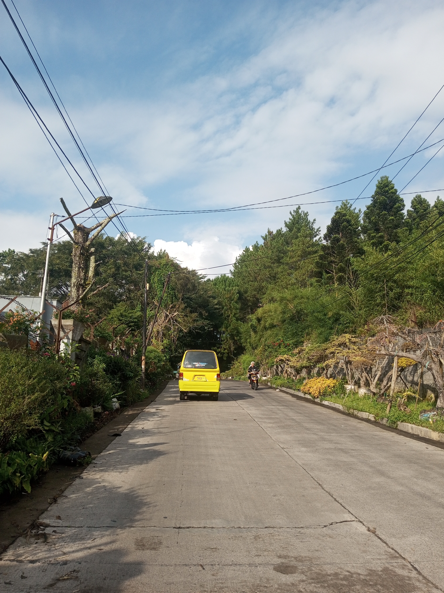 paved road in Mya Sit Kaing Ywar Thit, Myanmar, leading away from the viewer. A yellow van is traveling down the road in the same direction. A person on a motorcycle is also traveling down the road in the same direction, further away than the van. Overhead, there are several dark electrical wires. The roadside is lined with vegetation, including trees, shrubs, and flowers. On the left, there is a tree and a grey concrete fence. The sky is blue with scattered white clouds.
