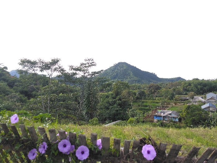 The image displays a rural, mountainous landscape under a bright, diffuse sky, characteristic of a tropical or subtropical region, and does not visually correspond to the city of Berger, Norway. In the immediate foreground, a rustic wooden fence, likely composed of vertical posts, is partially visible, spanning the lower portion of the frame. Numerous vibrant purple, trumpet-shaped flowers, consistent with morning glories, are intertwined with and blooming along this fence. Behind the fence, a sloping area of green grass and foliage leads to a small village settlement. This settlement includes several single-story houses, some featuring distinct blue roofs, interspersed among cultivated fields or terraces on the hillsides. The mid-to-background is dominated by heavily forested hills and a prominent, conical mountain, all densely covered in verdant trees and plant life. No people, specific actions, or interactions are visible.