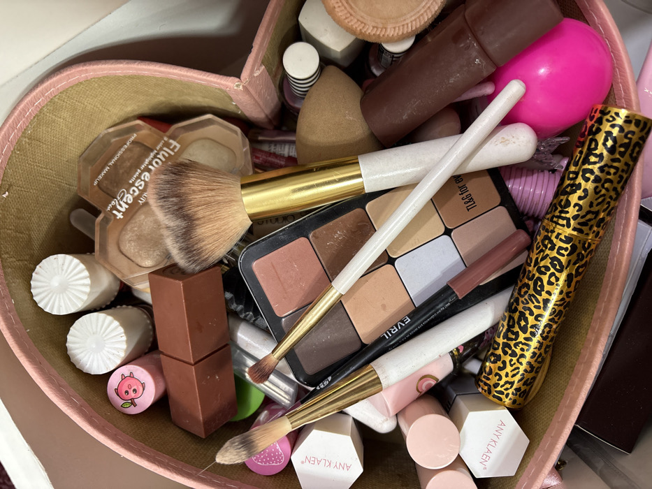 - "A heart-shaped container is filled with assorted makeup items, including a dual lipstick, powder compacts, foundation sticks in shades of brown and pink, a makeup sponge, several makeup brushes with gold and white handles, an eyeshadow palette with neutral tones, a black eyeliner pencil, and tubes of lip gloss or liquid lipstick" by FM-ihvq52, licensed under CC BY 4.0