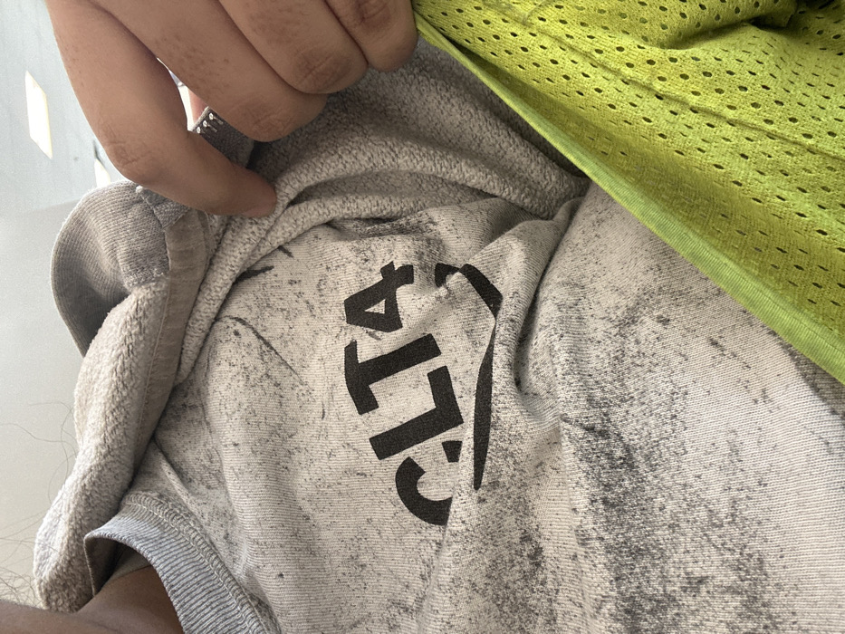 person wearing a grey, mottled sweatshirt with a large, stylized black logo that appears to read "CLTA". A neon green, mesh sports jersey is visible underneath the sweatshirt. The sweatshirt has a comfortable, worn texture. A hand is visible, pulling up the neckline of the sweatshirt. The overall impression is casual and relaxed.