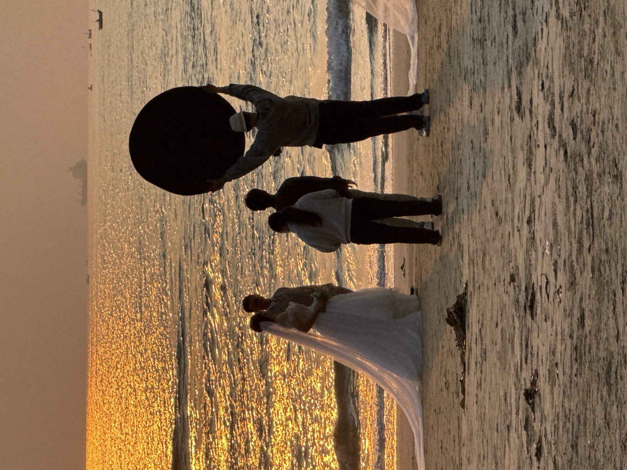 On a beach, likely in Đà Nẵng, Vietnam, during golden hour, a wedding photoshoot is in progress