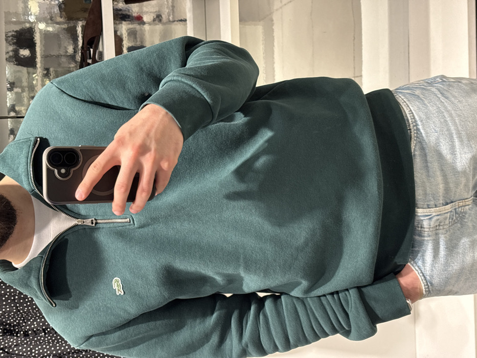 A male individual is depicted from the upper chest to just below the waist, facing forward, likely in a mirror within a retail clothing store. His face is obscured by a dark-colored smartphone, held in his right hand, positioned as if capturing a photograph. The phone features a dual-camera setup and a transparent case with a visible circular magnetic attachment. The individual wears a dark teal quarter-zip sweatshirt with a metal zipper and collar, over a white t-shirt, the collar of which is visible. A green crocodile logo, identifying the brand Lacoste, is present on the left chest. He wears light-wash blue jeans, with his left hand partially inserted into the front pocket. A thin, light-colored bracelet is visible on his left wrist. The background, largely blurred, depicts the interior of a commercial space with white shelving units displaying indistinct items, including what appears to be a brown loafer shoe on a shelf to the right. To the left, a dark fabric with white polka dots is partially visible. The reflective quality of some surfaces is evident. The image contains no explicit signage or architectural features to determine a specific location within Sofia, Bulgaria.