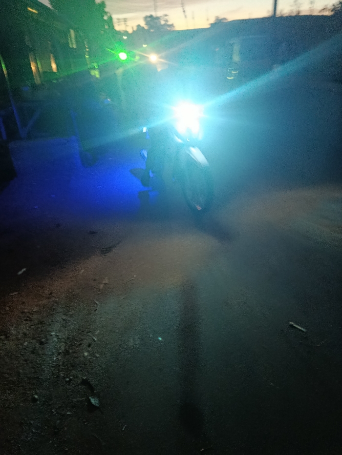 The image depicts an outdoor scene in Barakin Lerawi, Nigeria, at what appears to be late evening or night. A motorcycle is positioned in the mid-ground, centrally aligned, with its bright, intense white/blue LED headlight fully illuminated and facing the viewer. The headlight creates a significant lens flare, obscuring some front details of the vehicle. The motorcycle also exhibits blue underglow lighting, casting a distinct blue luminescence onto the ground immediately beneath it and to its left. To the left of the motorcycle, a green light source is visible, along with another warmer-toned light further behind it. In the background on the left, a dark structure, possibly a building or shed, is partially visible. The sky above the background structures shows faint light, indicating twilight conditions. The ground surface in the foreground and mid-ground is a dark, uneven, possibly unpaved or poorly paved path, exhibiting various textures and debris, with shadows and light reflections from the motorcycle's lights. No individuals are visible in the frame.