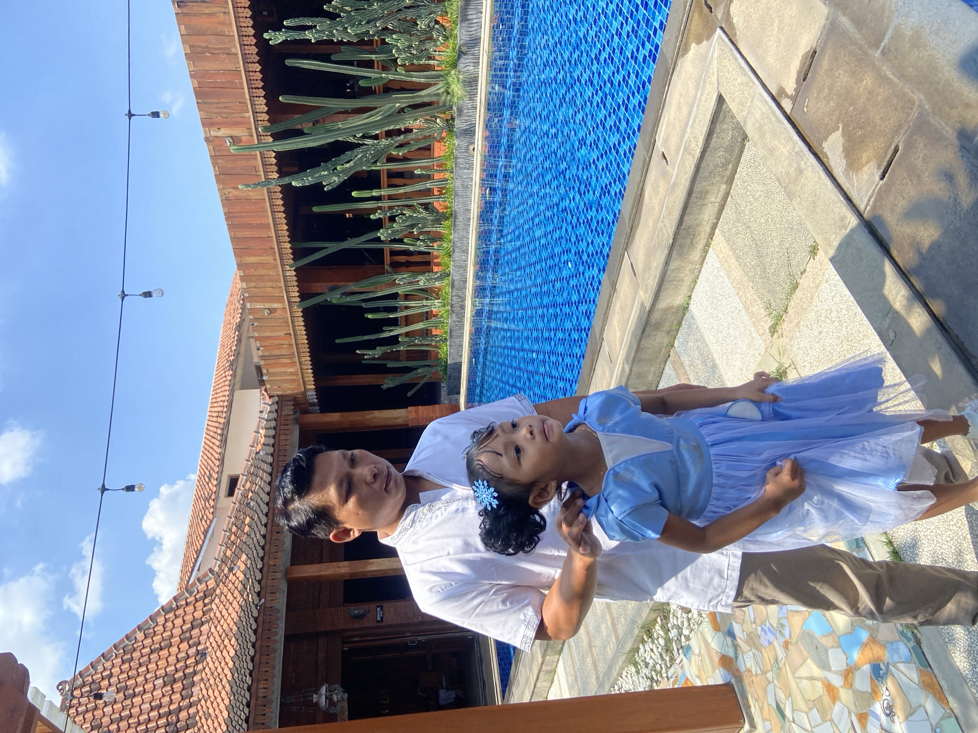 A man stands next to a pool with a girl in a blue dress in Kramat, Indonesia. The pool has blue tiles and is lined with cacti. The man is wearing a white shirt and khaki pants. The girl has a blue snowflake hair clip. The background includes a building with a red tile roof and exposed wooden beams, as well as string lights overhead.