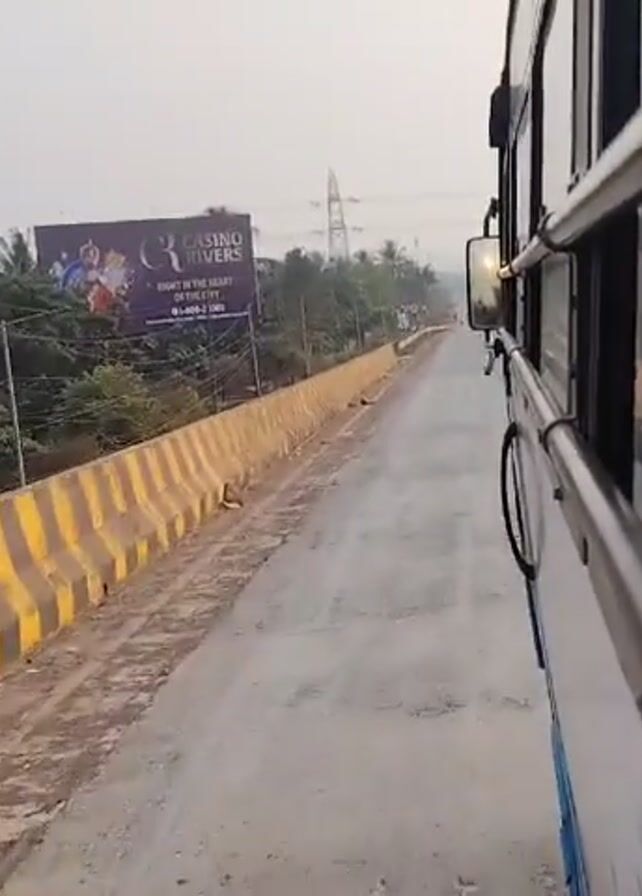 A bus drives down a concrete bridge lined with yellow and black striped barriers. A large billboard advertising "Casino Rivers" is visible on the left side of the road. The sky is overcast. Trees are visible in the distance.