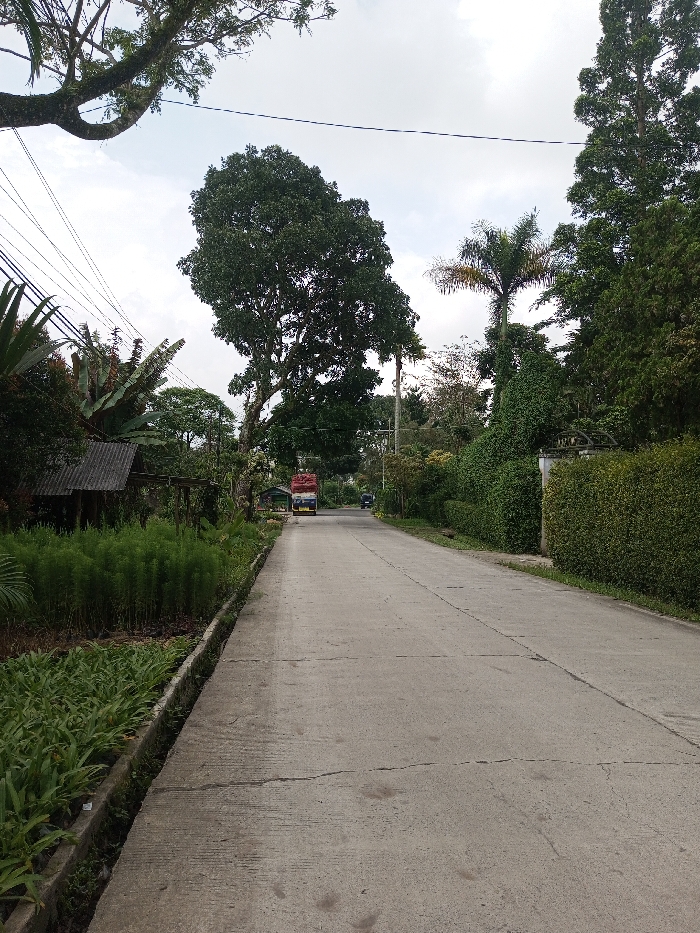 The image depicts a concrete road extending into the distance under an overcast sky in Sandamal Eliya, Sri Lanka. The road surface exhibits expansion joints and minor cracks. On the left, a concrete drainage ditch runs parallel to the road, bordered by dense green foliage, including small, uniform plants in the foreground and a taller, varied growth behind them. A small structure with a corrugated metal roof is partially visible behind the plants on the left. Overhead, multiple utility lines traverse the upper left quadrant. A prominent, large tree with a dense canopy stands on the left side, further down the road. On the right, a neatly trimmed green hedge lines the road, behind which a white or light-colored gate structure with an arched top is partially visible, indicating an entrance to a property. Various other trees, including a distinct palm tree with yellowish fronds, are present along the right side. In the mid-distance, a blue truck with a red cab, heavily loaded with red material, is positioned on the left side of the road, facing away from the viewer. A second, smaller, dark-colored vehicle is visible further down the road, also moving away. No individuals are present in the scene.