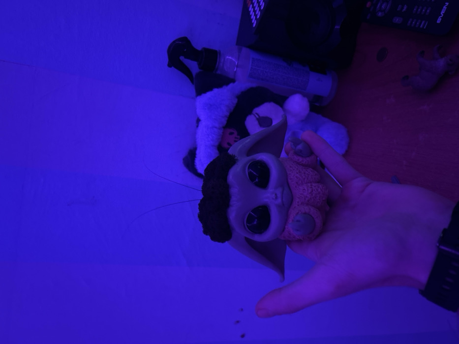 - "In a room bathed in blue light, a hand holds a Baby Yoda figurine with large, dark eyes and a fuzzy black headband" by FM-m8XFL2, licensed under CC BY 4.0