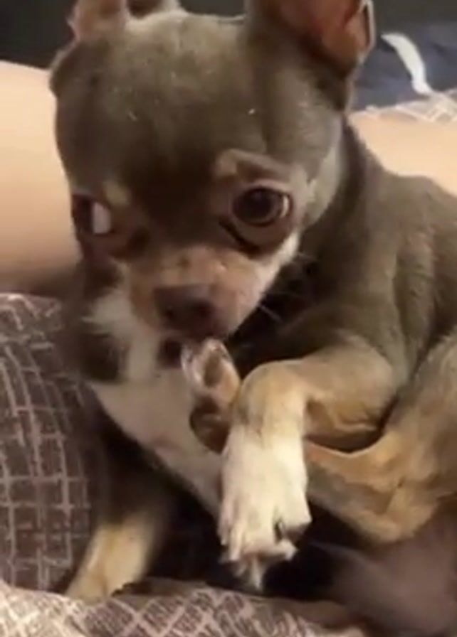 A brown and white chihuahua is sitting on top of a human and licking its paw