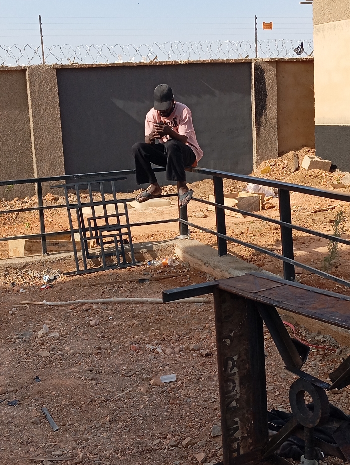 A male individual is depicted outdoors under clear daylight in Reifild-Ist, Nigeria. He is seated on a horizontal black metal railing, facing slightly left and looking down at a smartphone held in both hands. The man wears a black baseball cap, a light pink short-sleeved t-shirt, dark trousers, and open-toed sandals. Behind him, a low concrete wall is segmented into a textured brownish-grey section on the left and a smooth dark grey section on the right. Above the wall, a security fence topped with coiled razor wire extends horizontally under a clear blue sky. The ground is unpaved, consisting of reddish-brown soil mixed with gravel and scattered debris including plastic fragments and small concrete pieces. To the left of the seated individual, a black metal grid structure rests on the ground. To the right, a light-colored building is partially visible in the background. In the foreground, a dark, possibly rusted, metal structure with partially visible vertical text, appearing to read "IRON", extends from the bottom right corner of the frame.