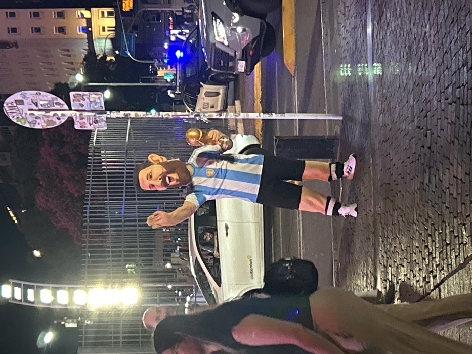- "A man in an Argentina soccer jersey, shorts, and Adidas sneakers, carrying a World Cup trophy, stands on a street corner next to a sign covered in stickers" by FM-9RuKG2, licensed under CC BY 4.0