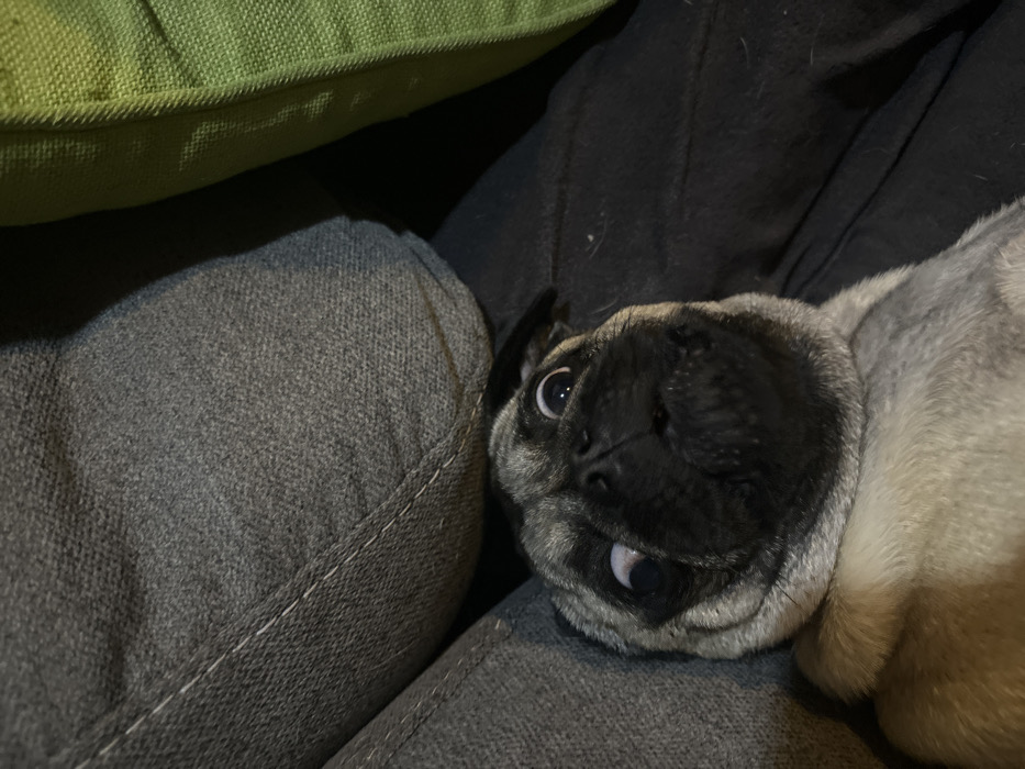 - "A pug rests on a gray fabric couch with a green cushion above" by FM-rJJmw2, licensed under CC BY 4.0