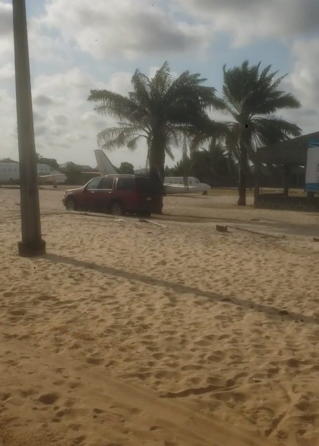 The scene shows a beach setting with sand in the foreground and a view extending into the background. In the background, palm trees are visible, along with vehicles, including what appears to be a red car. The sky is partially visible, featuring a mix of blue sky and white clouds. A utility pole with wires is prominent in the lower left corner of the view. The image is oriented vertically.