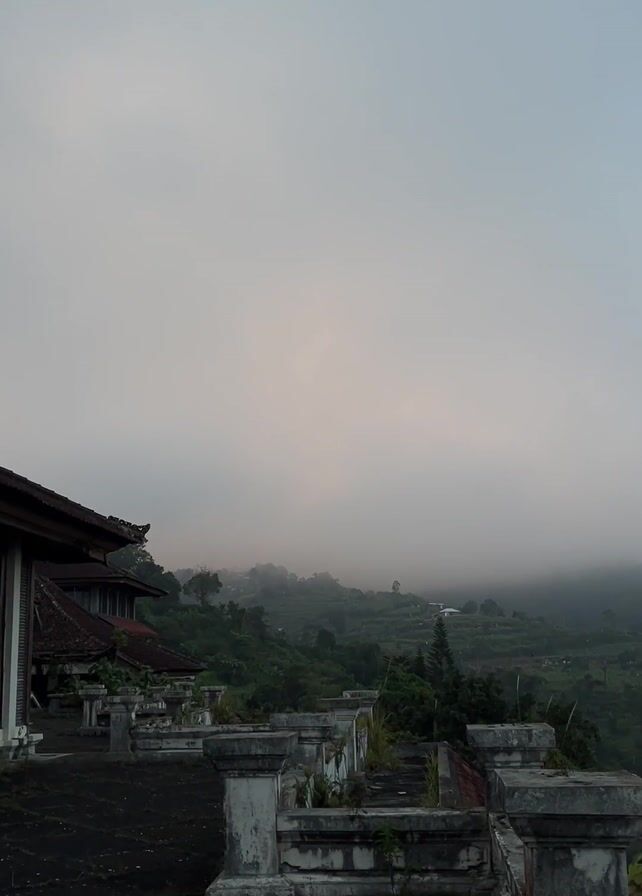 misty mountain landscape viewed from a dilapidated building's balcony