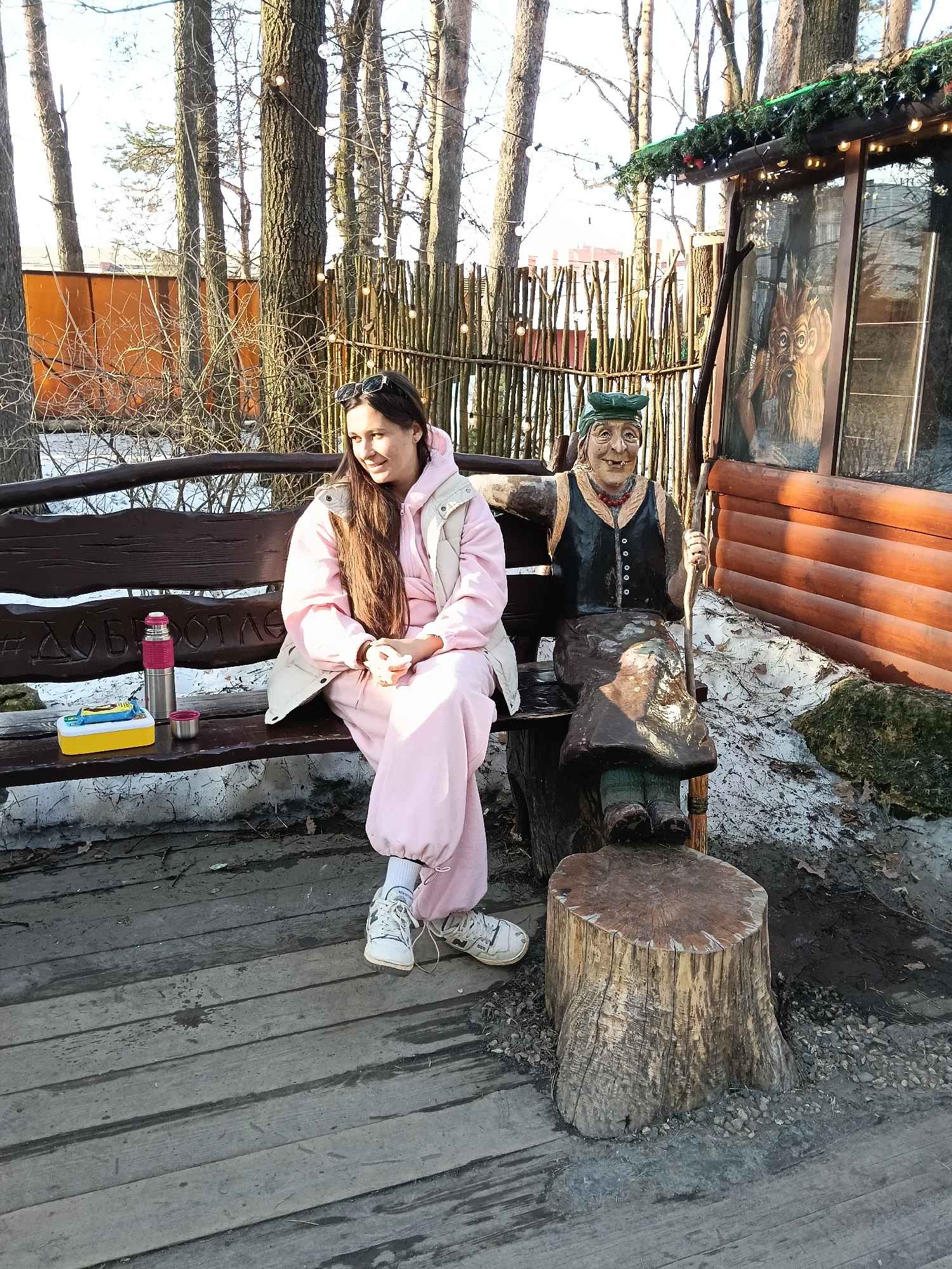 This image depicts a themed outdoor recreational area within a park in Domodedovo, Russia. The scene is set in what appears to be late winter or early spring, characterized by numerous tall, bare-branched trees and scattered patches of snow on the ground. The foreground features a weathered wooden plank platform. A single female subject, an adult with long, dark brown hair, is seated on the left side of a dark brown, carved wooden bench. She wears a light pink hooded jumpsuit or tracksuit, a cream-colored puffer vest, and white sneakers with white socks. Sunglasses are pushed onto the top of her head. Her hands are clasped, and she is looking to her right with a slight smile. To her right, a carved wooden statue of an elderly woman, reminiscent of a folkloric figure like Baba Yaga, occupies the remainder of the bench. The statue features a prominent nose, visible teeth, a green head covering, a dark vest, a dark skirt, and dark shoes. It holds a wooden staff or broomstick in its right hand. Its feet rest on a small, cut tree stump positioned on the ground. A necklace with red beads is visible on the statue. On the bench to the left of the female subject, a silver and pink thermos bottle, a small silver cup, and a yellow and blue plastic container are present. The backrest of the bench is carved with the Russian word "ДОБРОТА" (Kindness). In the background, a rustic fence constructed from vertical wooden poles is visible. To the right of the bench, a small wooden building with log siding features a window, which reflects trees and possibly another artistic carving. The building's roof overhang is decorated with green garland and string lights. Additional string lights are strung between the background trees. The ground around the bench consists of dirt, gravel, and small patches of snow.