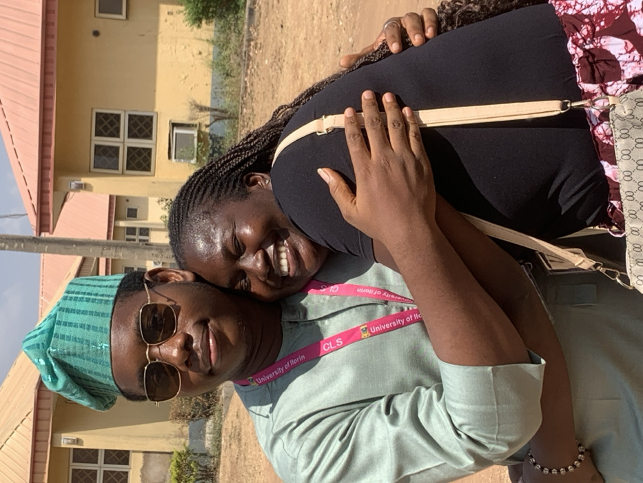 A frontal medium close-up photograph depicts two individuals, a male and a female, embracing outdoors on a sunny day at the University of Ilorin, Apata Yakuba, Nigeria