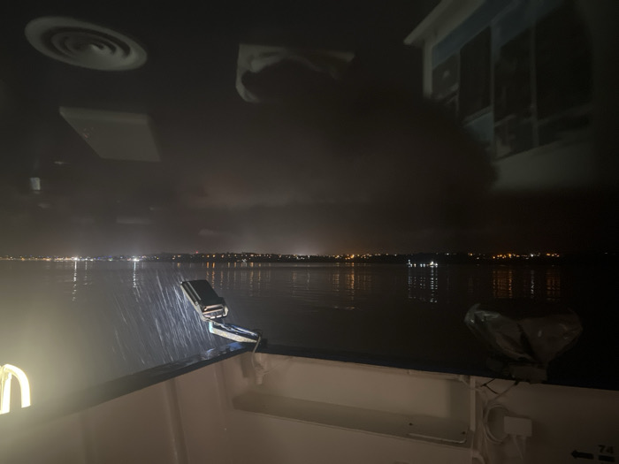 A nighttime view from a boat or ferry. Reflections on the water show a distant city's lights. The boat's interior, visible through the glass, includes a ceiling with circular vents and a window. A spotlight shines on the deck. The overall scene is dark and muted, emphasizing the contrast between the illuminated city and the dark water.
