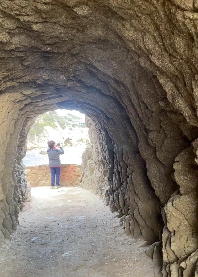 woman at the end of a rock tunnel taking pictures with a phone. Then, the video moves to a shot of tree roots clinging to a rocky hillside overlooking the ocean. The video ends with a shot of the ocean under a cloudy sky, with rocks in the foreground.