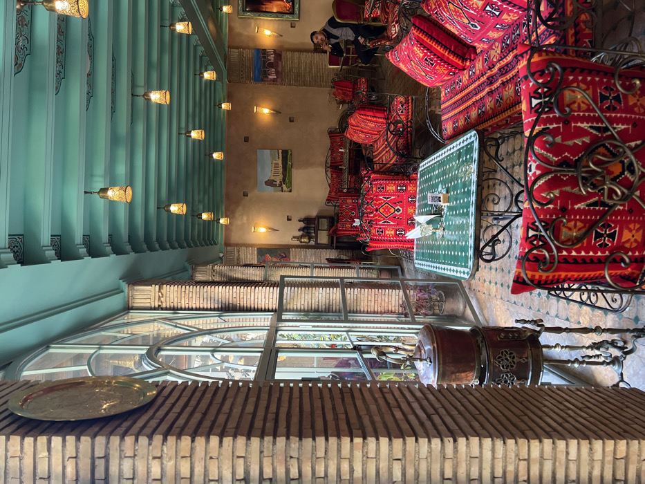 The interior of a restaurant is showcased with red patterned seating and green tables. The ceiling is light blue, adorned with hanging ornate lamps. The walls are painted a neutral brown, accented with framed artwork and sconces. A brick ledge with a copper samovar is positioned in front of a window, adding a unique decorative element. The overall ambiance evokes a traditional, cozy setting.