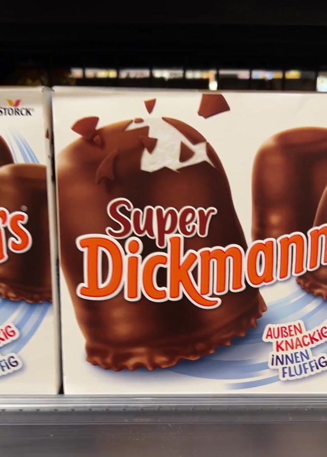 two rows of boxes of Storck brand candies on a store shelf. The top row has boxes of "Super Dickmann's" chocolate-covered marshmallow treats. The bottom row has boxes of "mini Dickmann's Schoko TRIO" treats. The boxes have images of the candies.