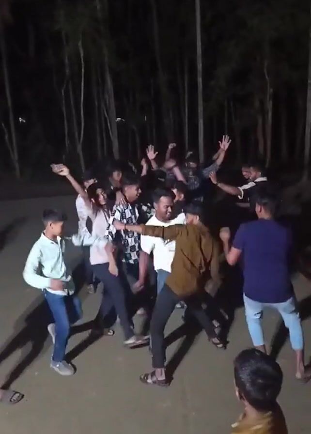 A group of about a dozen young men are dancing together in an outdoor area at night