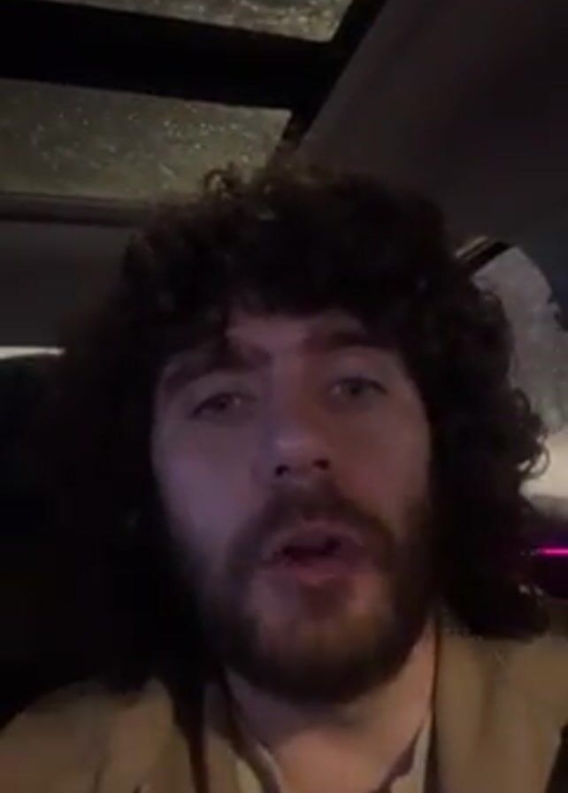 A man with curly brown hair and a beard is inside a car speaking into the camera. He wears a brown jacket. The car has a sunroof with rain visible on the glass. There are streetlights visible through the sunroof. There is music playing in the background.