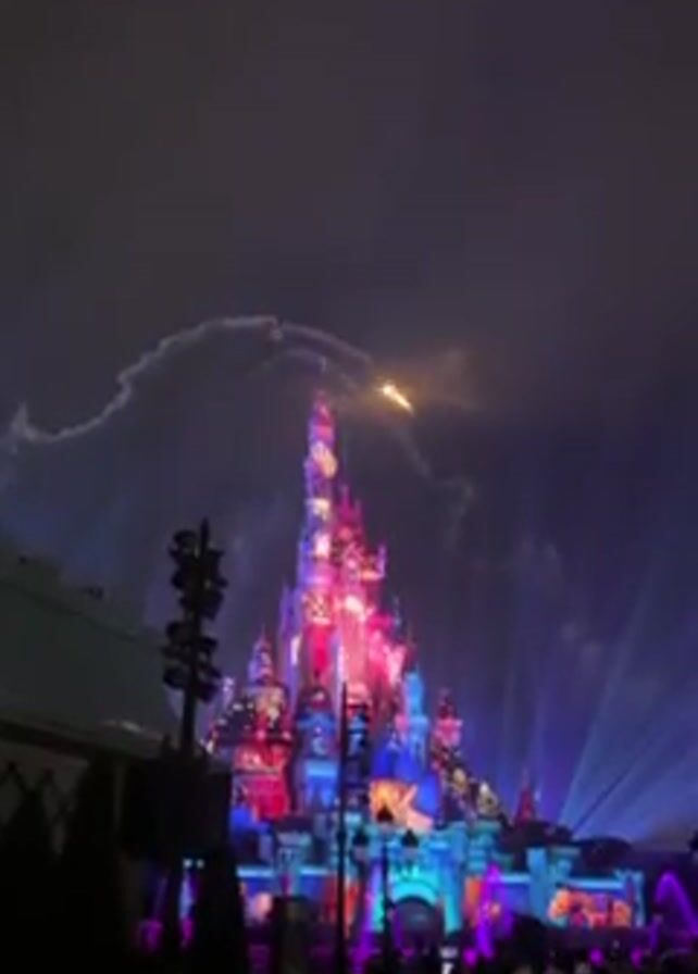 Cinderella's castle at Disney in the evening, decorated with a light show of purple, pink, blue, red, and orange. A light or firework is moving around in a circle in the sky above the castle, tracing the perimeter of a cloud. At the bottom of the frame, people stand watching, some with their phones out. Some light fixtures are in the mid-left.