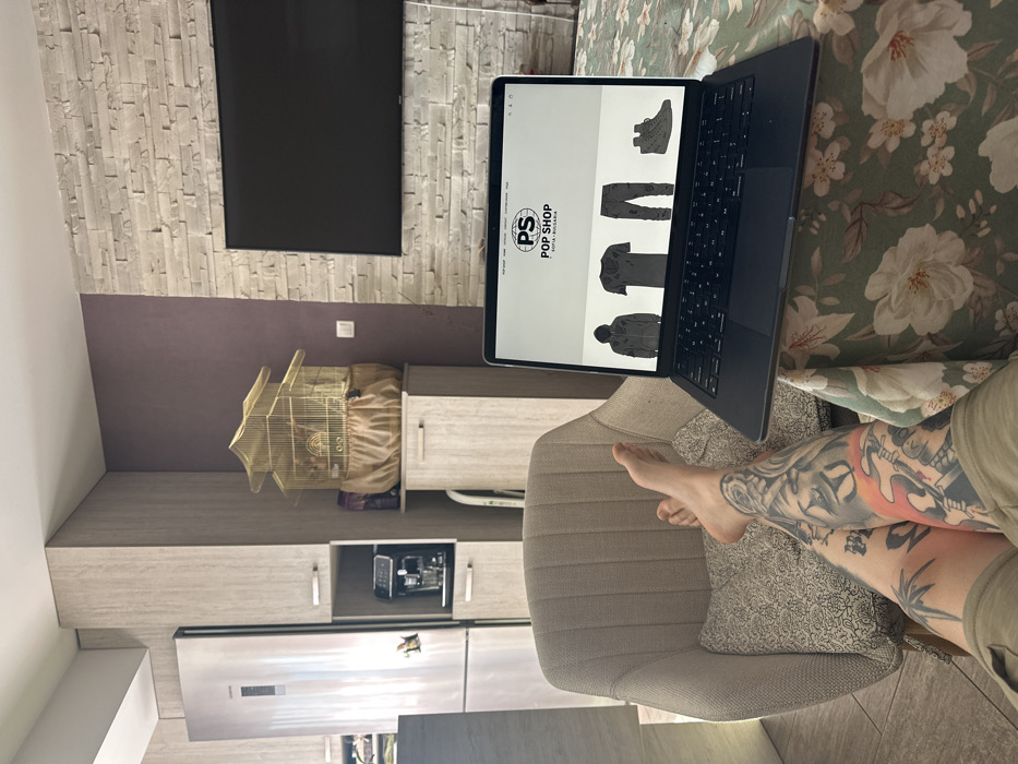 An individual is depicted indoors in a residential setting in Voluyak, Bulgaria, reclining with their bare, extensively tattooed legs elevated. The individual's legs, adorned with various designs including a prominent skull, floral patterns, and a leaf motif, are clad in khaki shorts. A dark grey laptop, appearing to be a MacBook model, rests on a green fabric surface patterned with white flowers, directly in front of the individual's legs. The laptop screen displays a website header featuring "PS POP SHOP SOFIA • BULGARIA" and images of four items for sale: a grey hoodie, a grey t-shirt, grey pants, and grey high-top sneakers. To the immediate left, a portion of a beige upholstered armchair, from which the legs extend, is visible. In the background, on the left, a stainless steel double-door refrigerator is integrated into light wood-toned cabinetry. Adjacent to the refrigerator, a section of the cabinetry reveals an espresso machine. Further right, a golden, pagoda-style birdcage with a light brown fabric bottom cover sits atop another light wood-toned cabinet. A small bird is discernible within the cage. The wall behind these cabinets and the birdcage is painted a solid plum color. To the right, a large, dark-screened television is mounted on an accent wall composed of grey, stacked stone veneer panels. The flooring consists of light-colored tiles.